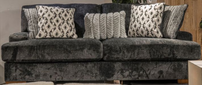 Upholstered in a soft chunky chenille featuring jacquard accent toss pillow and fur kidney pillow