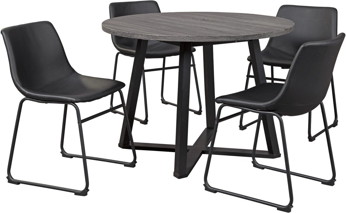 With its distinctive features, this striking dining set serves up a fresh twist on mid-century inspired style. Faux leather upholstery on the chair has a charmingly vintage tone. The table’s mixed material and two-tone aesthetic are beautifully in balance. Sporting a dramatic charcoal gray hue, the top is crafted of durable melamine, allowing it to weather years of family thrills and spills. What a timeless look for eat-in kitchens and casually cool dining rooms.Read More