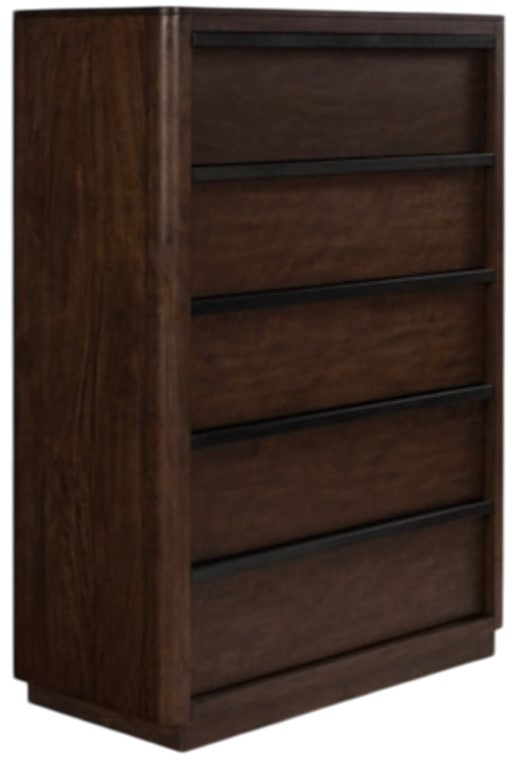 Casual contemporary styling with a decidedly modern vibe. This chest of drawers is warm and inviting with a rich dark brown finish, adorning your restful retreat with on-trend elegance. Full-length metal pulls in a matte black finish add a subtly cool touch to spacious storage drawers.Read More
