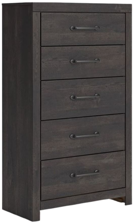 This Hollivern chest of drawers puts a casually chic twist on everyday function. Its rustic charcoal finish pairs well with other neutrals and pops of color alike, giving you the flexibility to change up your aesthetic as you please. Smooth-gliding drawers keep clothes and bed linens stored in style.Read More