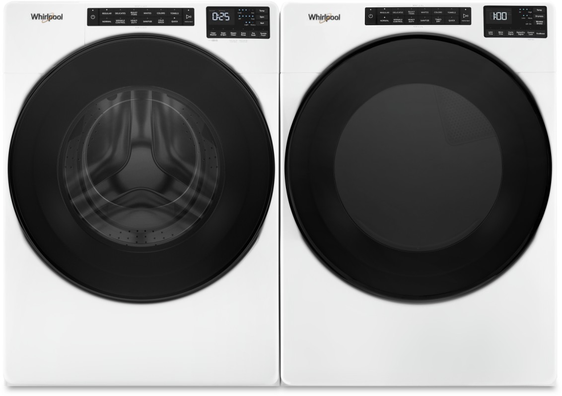 Whirlpool® White Front Load Laundry Pair with a 5.2 cu. ft. capacity front load washer and a 7.4 cu. ft. capacity front load electric dryer.Read More